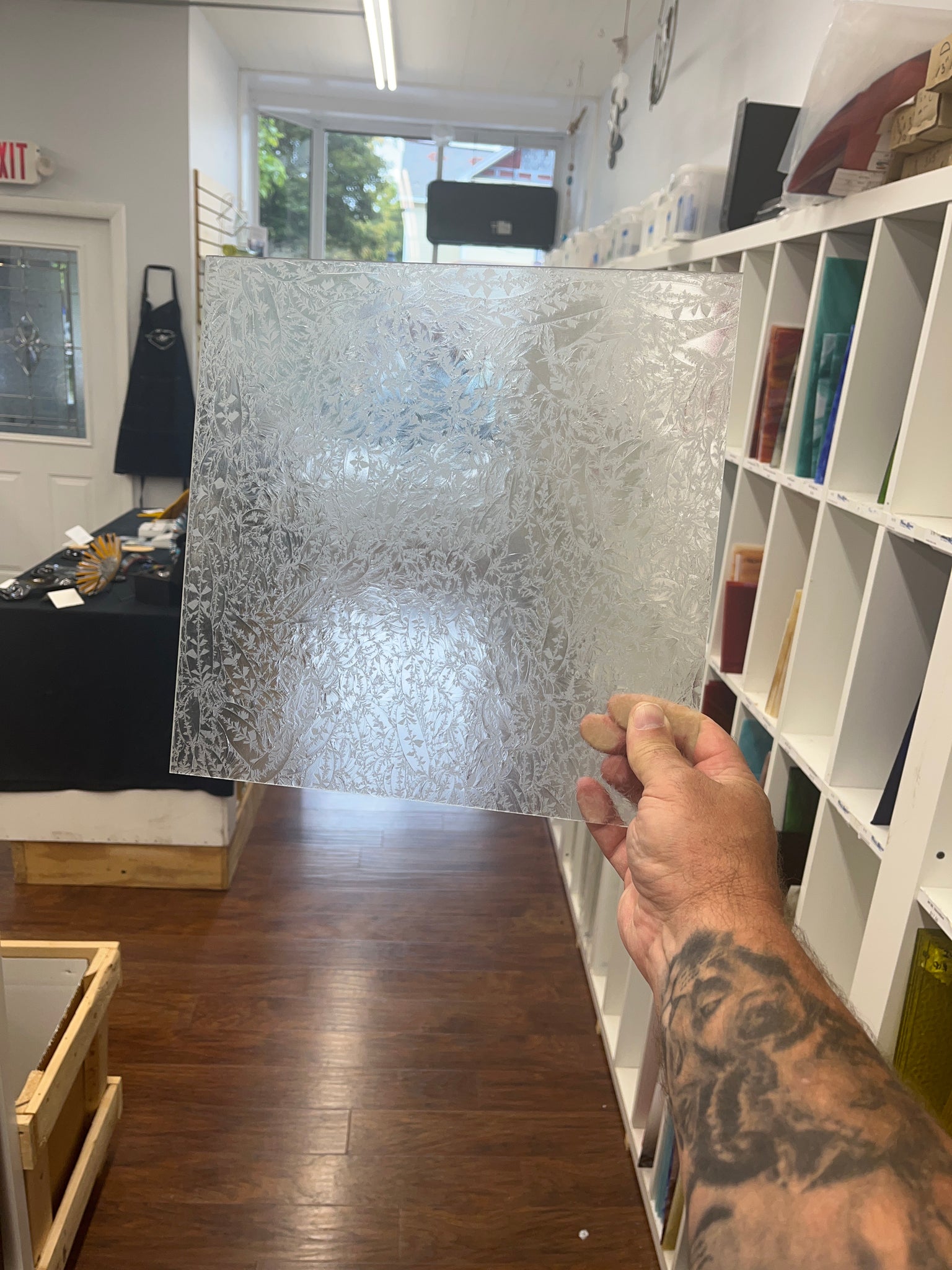 Glue Chip Glass (Jack Frost Glass) has a fern or frost like texture. The texture is created by applying glue to sandblasted sheet glass and chipping it off after it dries.